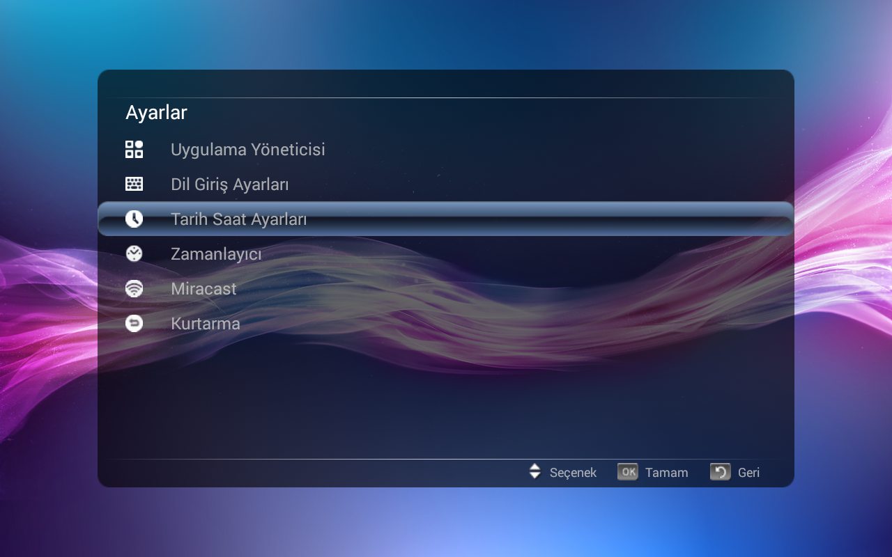 Cihazımızın ana sayfasında bulunan Ayarlar bölümüne tıklayıp açalım. Tarih-Saat Ayarları bölümünü açalım. Saat bölümünde el ile değiştirme işlemi yapabilirsiniz veya cihazınızın internet bağlantısı mevcut ise "ağ üzerinden otomatik zaman tarih ayarını" aktifleştiriniz.